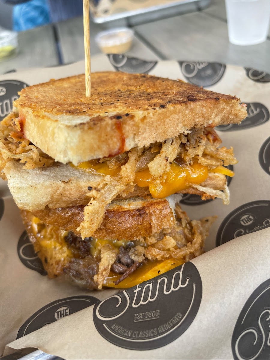The menu at The Stand is a treasure trove of mouthwatering options. Their signature Short Rib Grilled Cheese is a luxurious delight, featuring chipotle and beer-braised beef, layered with triple cheddar, crispy onion strings, and a rich hickory sauce—all encased in double parmesan crusted sourdough that will make your taste buds dance with delight. For those craving something with a kick, the Buffalo Chicken Sandwich delivers layers of flavor, while the BBQ Brisket on a Pretzel Roll is a crowd favorite, with its 14-hour smoked brisket complemented by sweet chili hickory glaze and spicy honey mustard BBQ sauce.